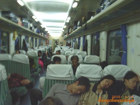 這是四號(hào)車廂,空位很多,一個(gè)人坐三人位,我高興了,心想今晚還能躺下睡。對(duì)面坐位上的小伙子,也是從峨眉上車的,得知我到西安且為無坐票,他比我還急:老人家,這節(jié)車廂上的旅客都是到成都的,下車騰空,要上坐簽號(hào)的旅客 ,你不能心安理得坐在這里,一到成都就得讓,現(xiàn)在要趕快到其它車廂去找坐位! 看來我高興得太早。