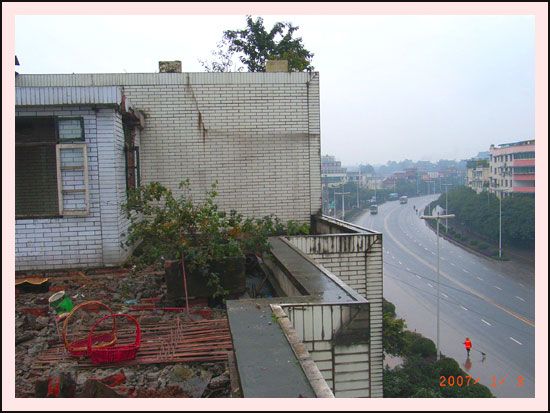 一陣陣震耳欲聾的咚咚咚,促使我走到樓道口看個究竟,民工正用大鐵錘打樓梯,一樓的水泥梯只剩下稀疏的鋼筋,我不說謊無論如何是上不去“拜托你們嘛,我是樓上的住戶,要上去看最后一眼”果然有有效,他們理解我的心情,兩個民工兄弟把我牽過險區(qū),一再囑咐注意安全,他們說,趁現(xiàn)在負(fù)責(zé)施工的頭兒沒在,你要快點(diǎn)下來哈。我小心翼翼上房頂,從不同的角度,拍下了幾張圖片。
