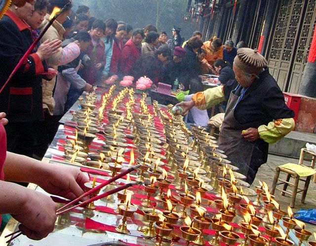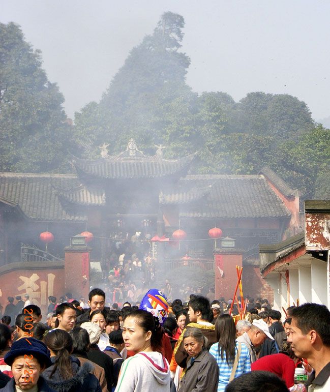 城北路口通往飛來殿的泥土公路上,川流不息,人頭攢動(dòng),據(jù)今晚峨眉山電視臺(tái)新聞節(jié)目播出的不完全統(tǒng)計(jì)的數(shù)據(jù),從早上六點(diǎn)下午四點(diǎn),有八萬人朝大廟飛來殿。我是八點(diǎn)鐘從家里出發(fā),遇到許多人返回,聽說祭祀拜王越早越好。公路未變,石子泥沙鄉(xiāng)土味,沒有市區(qū)油路寬敞,奈何橋依舊,血河兩岸搭滿接梯,從奈何橋到廟門紅墻,香火燃燒,紫煙繚繞,有人雙手合十祀拜許愿,默默無語,有人在與逝者對(duì)酒當(dāng)歌,或如述如泣,或談笑風(fēng)聲……此情此景,頗為壯觀,幾千年來,人們今天都要提著紅包,進(jìn)殿朝拜見大王。