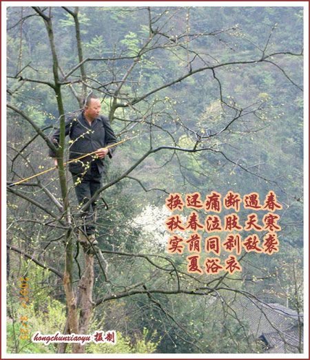原來,這陡坡上的柿子林,他家有48棵,是他娘兒倆的全部希望,母70多歲,妻早亡,沒留下孩子.他嘿嘿的笑著說:這里山高,媳婦不好找.我問去年收成怎么樣,他說去年不錯,柿子買了3000多元,他搖搖頭,哎!今年,今年春太早,倒春寒不得了,早芽全部死掉,和往年不一的的是,樹表皮遭遇罕見的蟲害,只有把皮子剝掉.樹枝修掉一部份,這些星星點點的二度芽兒,也染了病.