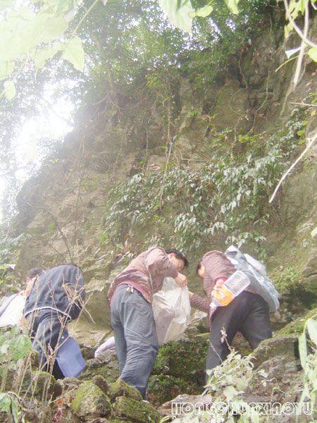 上得一面長長的陡峭的坡,哇,樹林,草叢里,有稀疏的雪,回頭看看農(nóng)家的房上也殘留著雪痕。再爬上林木叢生的山巖,有冰凝子呢,我小心奕奕經(jīng)一條羊腸小道平著走過去,見十幾號人在排隊取水,丈夫為了排隊,在半路就把我“甩”了,先到這里。哈哈,此時正輪到他取水。這里也變了,原來是自己帶著引水的竹筒,眼下,熱情的山民們在洞口接上引水的軟管,丈夫裝滿一瓶遞過來,我迫不及待咕嚕嚕喝了一半,!冒著熱氣的暖水,真舒服,他笑我,看你窮樣,在場的人都在笑,說慢慢喝,沒人和你爭,管你喝個夠!呵呵!我摘下眼鏡,把余下的半瓶子水澆在鏡片上,這是我第一次來這里跟一個老師學(xué)的,用水洗鏡片格外明凈,有很多人用水洗臉洗頭。以前我每次來,都要洗臉洗眼鏡,可謂醒腦清心明目。只可惜今天取水人太多,身后排著長隊,不能在此摸索,洗臉先免了。
