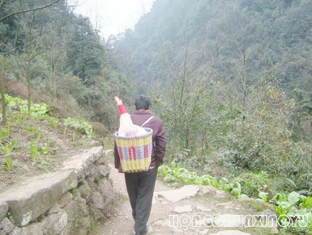 從林中傳來歡笑聲,一隊喜笑逐顏開的村民,哦,原來村里有喜事,看那個背著豬大腿的年青人,是送“離娘肉”,這個地方,“離娘肉”是男方接親時的重要禮節(jié),必需要送女方父母一塊大肉,女方父母才能讓男方把人接走,原來時興肋條肉,現(xiàn)在時興送一只約三十斤重的一肘豬大腿。天剛剛亮第一隊接新娘子的人就去了,他們是第二隊接親的人,等著殺豬取肉,宰下大腿就送走。我立即舉起相機(jī),可惜攝影技術(shù)太差,只能拍下背肉人的背影,嘿嘿!系著紅紙的“離娘肉”還是很惹眼的喔!