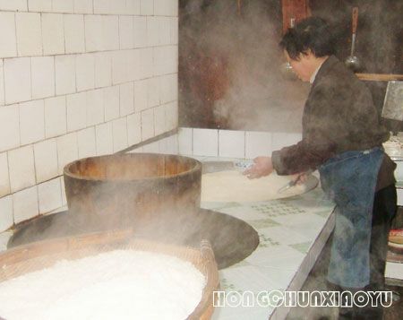取完水,裝好包,轉(zhuǎn)身往回走,農(nóng)家的屋頂升騰起炊煙,本來想美美的吃一頓豆花飯,不行呀,兩媽媽在家,要等我回家做午飯呢。我不余心,還是到張豆花家看看。哈哈,我立即舉起相機(jī),卡嚓 拍下她點(diǎn)豆花的情景。