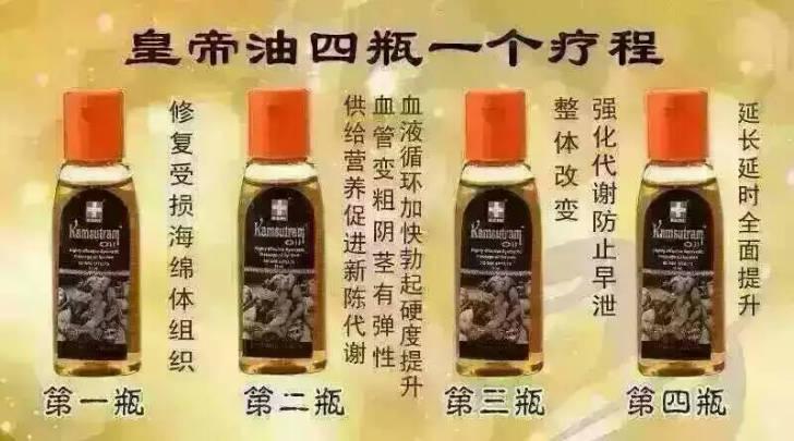 ②.皇帝油:印度進(jìn)口,主治陽痿早泄,能增大增粗,增加硬度,助勃,增加射精快感。還可以滋養(yǎng)睪丸,調(diào)節(jié)荷爾蒙!修復(fù)海綿體受損,讓男性更強(qiáng)