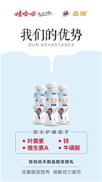 娃哈哈天眼晶睛是國內飲料龍頭企業(yè)娃哈哈集團推出了一款具有緩解視力疲勞功能的發(fā)酵乳飲料“晶睛”。娃哈哈天眼晶睛發(fā)酵乳飲料(簡稱:娃哈哈天眼晶睛),采用生物科技新成果特別研制而成,優(yōu)質奶源經兩種益生菌發(fā)酵后,能促進蛋白質的消化吸收,口感滑爽,腸道舒暢,喝奶同時能輕松保護視力,特別適合學生、白領等視力易疲勞者。填補市場空缺,“娃哈哈天眼晶睛”益視酸奶來之不易,據了解:娃哈哈早在2007年底就開始著手研發(fā)有助于緩解視疲勞的保健飲品,經過數千次的嚴謹試驗,歷時兩年多的不懈努力,終于得到了權威機構的認證,并在日前通過國家食品藥品監(jiān)督管理局批準,成為國內首款認證為保健食品的視力酸奶,明確具有“緩解視疲勞”的保健功效。