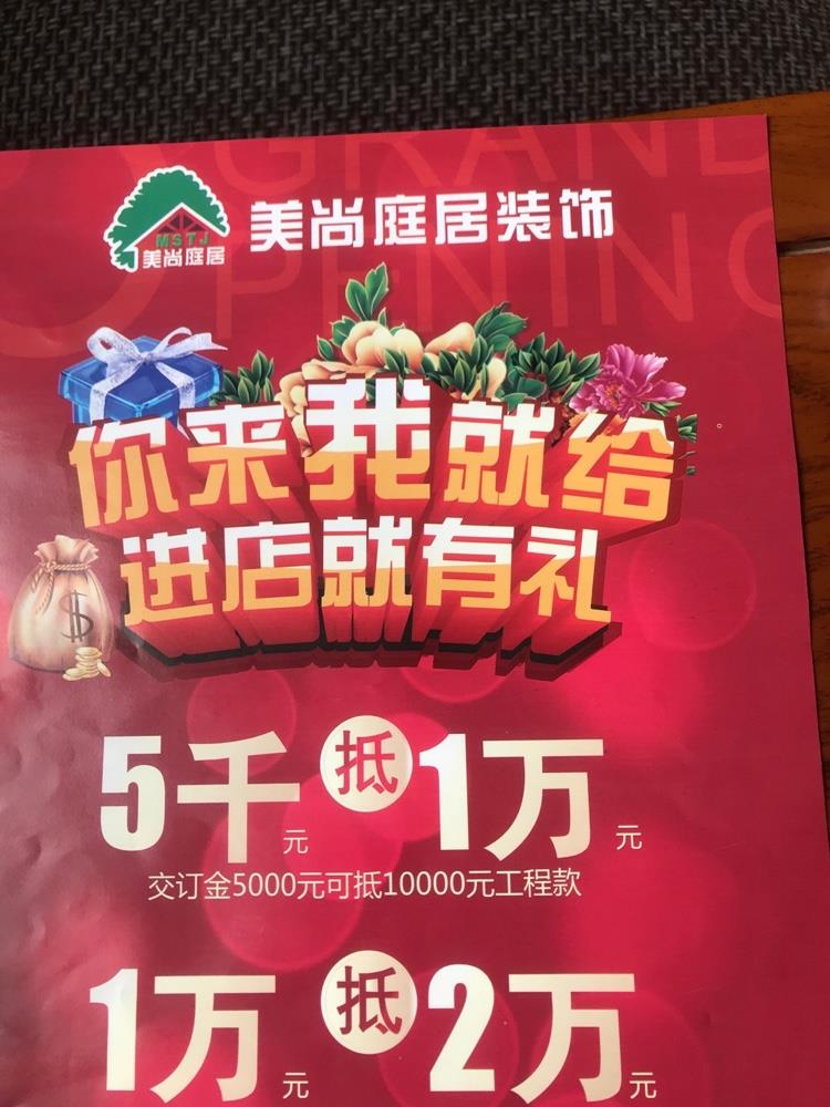 美尚庭居限時(shí)優(yōu)惠活動。交五千抵一萬,交一萬抵兩萬,活動力度大,更有六重好禮相送(知名凈水器,窗簾,全屋開關(guān)面板,名牌瓷磚,整屋知名墻面漆,水電材料升級)還有設(shè)計(jì)師免費(fèi)測量免費(fèi)出設(shè)計(jì)圖,包您滿意