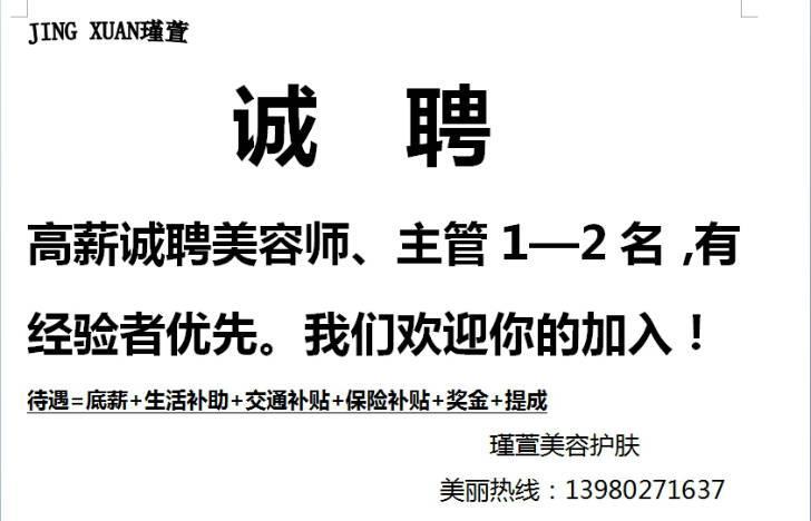 誠聘美容師、美容售后主管,有意者請了解。地址:青龍正興街 《瑾萱美容護(hù)膚》