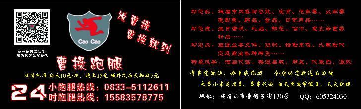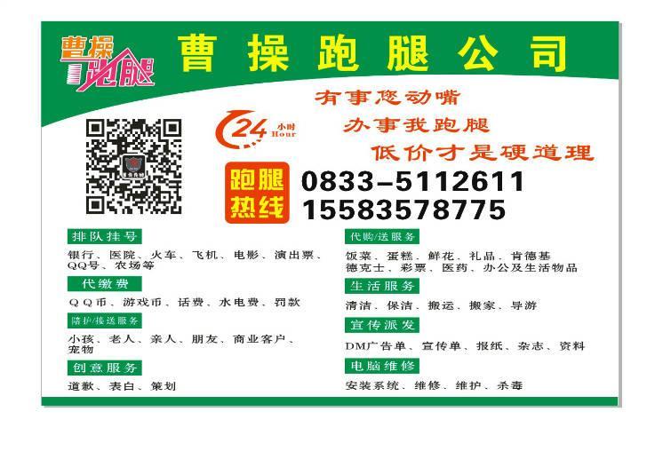 說曹操,曹操到,隨叫隨到有事您動嘴,辦事我跑腿,今后的您就是這么方便。大事小事麻煩事,事事代辦。白天黑夜節(jié)假日,天天跑腿。