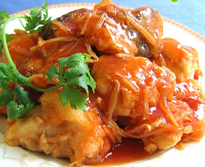 4、將調(diào)好的糖醋汁迅速淋在炸好的魚片上即可。