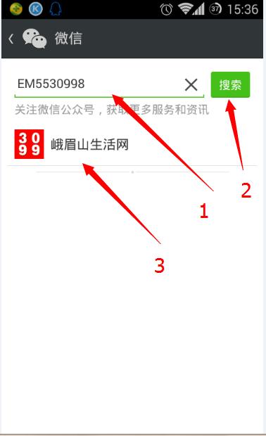 3.輸入公眾賬號,點擊搜索,點擊峨眉山生活網