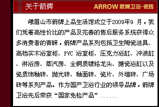 峨眉山市箭牌上品生活館成立于2009年9月,我們憑著高性價(jià)比的產(chǎn)品及完善的售后服務(wù)系統(tǒng)獲得眾多消費(fèi)者的青睞,箭牌產(chǎn)品系列包括衛(wèi)生陶瓷潔具、高檔實(shí)木浴室柜、PVC浴室柜、壓克力浴缸、沖浪缸、淋浴房、蒸汽房、全銅質(zhì)鍍鉻龍頭、搪瓷浴缸以及瓷質(zhì)飾釉磚、拋光磚、釉面磚、瓷片、外墻磚、廣場(chǎng)磚等系列產(chǎn)品。 作為國(guó)產(chǎn)衛(wèi)浴行業(yè)的領(lǐng)導(dǎo)品牌,箭牌衛(wèi)浴先后榮獲“國(guó)家免檢產(chǎn)品” “中國(guó)名牌產(chǎn)品”“中國(guó)馳名商標(biāo)”等榮譽(yù)稱號(hào)。箭牌產(chǎn)品先后通過(guò)美國(guó)標(biāo)準(zhǔn)“UPC”認(rèn)證、“國(guó)家節(jié)水型產(chǎn)品”、“3C認(rèn)證”、 “ISO14024中國(guó)環(huán)境標(biāo)志產(chǎn)品等認(rèn)證證書”。