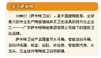 SUMMIT〔薩米特衛(wèi)浴〕,是中國(guó)建陶航母、全球最大的專業(yè)生產(chǎn)陶瓷墻地磚及衛(wèi)生潔具的現(xiàn)代化企業(yè)之一——廣東薩米特陶瓷集團(tuán)有限公司旗下的強(qiáng)勢(shì)衛(wèi)浴品牌。