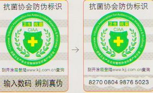 外包裝箱上貼有抗菌協(xié)會防偽標(biāo)識 刮開抗菌協(xié)會防偽標(biāo)識上數(shù)字信息碼涂層,