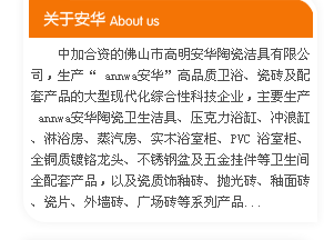中加合資的佛山市高明安華陶瓷潔具有限公司,生產(chǎn)“annwa安華”高品質(zhì)衛(wèi)浴、瓷磚及配套產(chǎn)品的大型現(xiàn)代化綜合性科技企業(yè),主要生產(chǎn)annwa安華陶瓷衛(wèi)生潔具、壓克力浴缸、沖浪缸、淋浴房、蒸汽房、實木浴室柜、PVC浴室柜、全銅質(zhì)鍍鉻龍頭、不銹鋼盆及五金掛件等衛(wèi)生間全配套產(chǎn)品,以及瓷質(zhì)飾釉磚、拋光磚、釉面磚、瓷片、外墻磚、廣場磚等系列產(chǎn)品。