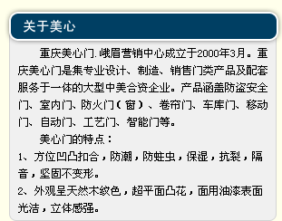 重慶美心集團(tuán)創(chuàng)建于1989年,是專業(yè)設(shè)計(jì)、制造、銷售防盜安全門、室內(nèi)門、工藝門、防火門(窗)、卷簾門、車庫(kù)門、移動(dòng)門、自動(dòng)門、智能門及配套服務(wù)一體化的大型中美合資企業(yè)。公司地處科技產(chǎn)業(yè)匯集的重慶經(jīng)濟(jì)技術(shù)開發(fā)區(qū)(國(guó)家級(jí)),占地近250畝,擁有現(xiàn)代化的標(biāo)準(zhǔn)廠房,平均每天生產(chǎn)13000多套門。經(jīng)過(guò)數(shù)年經(jīng)營(yíng),美心產(chǎn)品暢銷全國(guó)各地乃至歐洲、美洲、南亞、東南亞、中東等30多個(gè)國(guó)家和地區(qū),綜合實(shí)力居全國(guó)同行前列。
