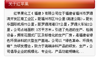 紅蘋果化工(福建)有限公司位于福建省福州市羅源灣開發(fā)區(qū)南工業(yè)區(qū),引進(jìn)了先進(jìn)的生產(chǎn)、檢測設(shè)備,擁有花園式廠區(qū)及標(biāo)準(zhǔn)化的生產(chǎn)廠房,是福建省綠色環(huán)保涂料的大型生產(chǎn)基地.公司以“綠色革命、環(huán)保先鋒”為研發(fā)理念,致力于高端涂料產(chǎn)品的研發(fā)、生產(chǎn),公司倡導(dǎo)企業(yè)的規(guī)模化、專業(yè)化、產(chǎn)品功能明確化,現(xiàn)年生產(chǎn)能力達(dá)5萬噸,生產(chǎn)的產(chǎn)品有民用家裝漆系列;建筑工程漆系列;家具、工藝漆系列;工業(yè)漆系列等上百個品種,是一家集專業(yè)研發(fā)、生產(chǎn)綜合型現(xiàn)代化高科技創(chuàng)新型企業(yè)。紅蘋果漆峨眉旗艦店成立于2010年7月,位于峨眉山市金頂北路中段161--164號。