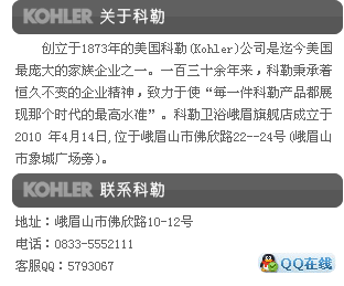 創(chuàng)立于1873年的美國(guó)科勒(Kohler)公司是迄今美國(guó)最龐大的家族企業(yè)之一。一百三十余年來(lái),科勒秉承著恒久不變的企業(yè)精神,致力于使"每一件科勒產(chǎn)品都展現(xiàn)那個(gè)時(shí)代的最高水準(zhǔn)"?评招l(wèi)浴峨眉旗艦店成立于2010年4月14日,位于峨眉山市佛欣路22--24號(hào)(峨眉山市象城廣場(chǎng)旁).無(wú)可挑剔的卓越品質(zhì),領(lǐng)先行業(yè)的研發(fā)技術(shù),精益求精的制造工藝,以及時(shí)尚前沿的藝術(shù)設(shè)計(jì),使科勒精神在百年傳承中成為經(jīng)典。