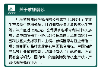 廣東蒙娜麗莎陶瓷有限公司成立于1998年,專(zhuān)業(yè)生產(chǎn)各類(lèi)中高檔瓷磚,目前擁有22條大型現(xiàn)代化生產(chǎn)線,年產(chǎn)值近20億元。公司擁有各項(xiàng)專(zhuān)利共計(jì)460多項(xiàng),是中國(guó)陶瓷工業(yè)協(xié)會(huì)副會(huì)長(zhǎng)單位,承擔(dān)國(guó)家十一五科技重大支撐項(xiàng)目,主編、參編國(guó)家與行業(yè)標(biāo)準(zhǔn)7項(xiàng);蒙娜麗莎品牌先后榮獲中國(guó)馳名商標(biāo)、中國(guó)名牌產(chǎn)品等行業(yè)最高榮譽(yù),品牌價(jià)值達(dá)24.06億元。公司擁有全球領(lǐng)先、國(guó)內(nèi)唯一的建筑陶瓷薄板生產(chǎn)線,產(chǎn)品代表陶瓷行業(yè)入選“中華人民共和國(guó)成立六十周年展”,公司主要起草的國(guó)家相關(guān)產(chǎn)品標(biāo)準(zhǔn)和施工標(biāo)準(zhǔn)也已頒布實(shí)施。公司還建有目前全球最大的蒙娜麗莎主題博物館—中國(guó)蒙娜麗莎文化藝術(shù)館,面向海內(nèi)外開(kāi)展文化和藝術(shù)交流。
