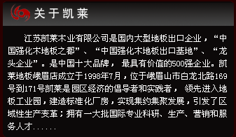 江蘇凱萊木業(yè)有限公司是國內(nèi)大型地板出口企業(yè),"中國強化木地板之都"、"中國強化木地板出口基地“龍頭企業(yè)”。是中國十大品牌,最具有價值的500強企業(yè)。凱萊地板峨眉店成立于1998年7月,位于峨眉山市白龍北路169號到171號