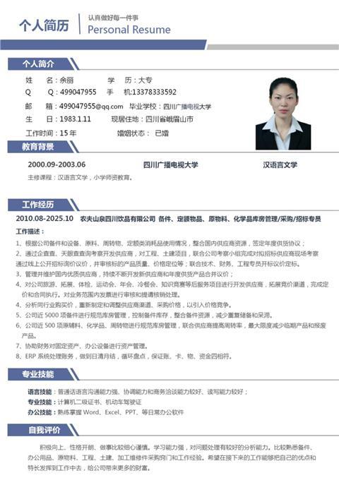 工作經(jīng)歷:2010年-2025年在農(nóng)夫山泉四川峨眉山飲品有限公司擔(dān)任采購(gòu)庫(kù)房工作,負(fù)責(zé)低值易耗,定額,設(shè)備,化學(xué)品,工程,土建等的采購(gòu)和庫(kù)房管理。