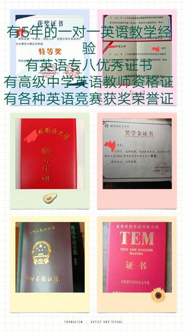 專業(yè)/技能:有豐富的教學(xué)經(jīng)驗(yàn)和方法,有5年的一對(duì)一英語家教簡歷,英語專八優(yōu)秀,有高級(jí)中學(xué)英語教師資格證,有各種英語競賽獲獎(jiǎng)榮譽(yù)證書