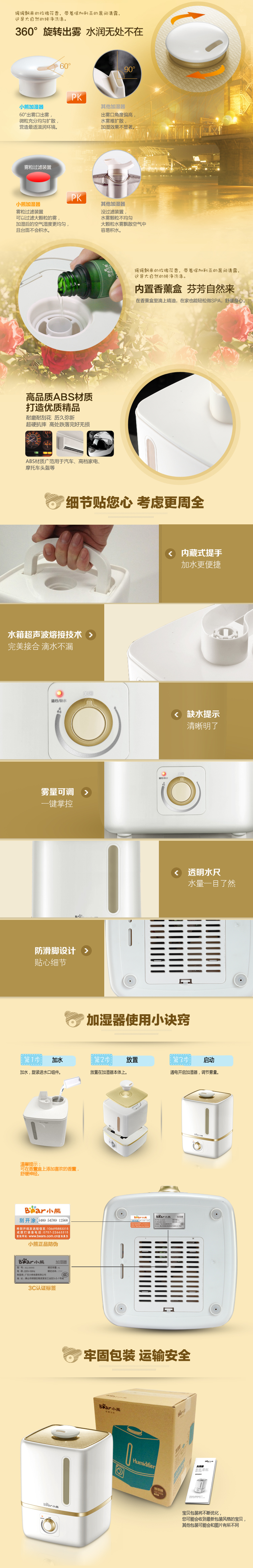 小熊4L大容量靜音加濕器JSQ-240WB經(jīng)典土豪金高品質(zhì)霧化板,抗菌ABS水箱不怕細(xì)菌滋生,帶香薰功能