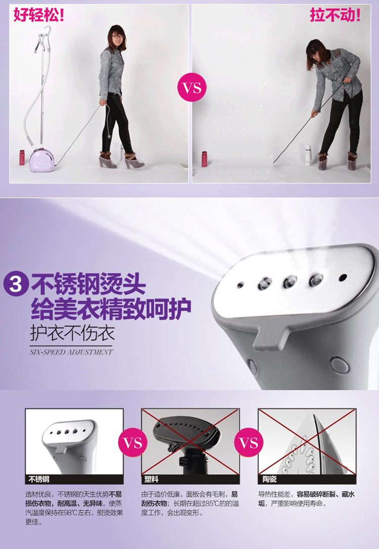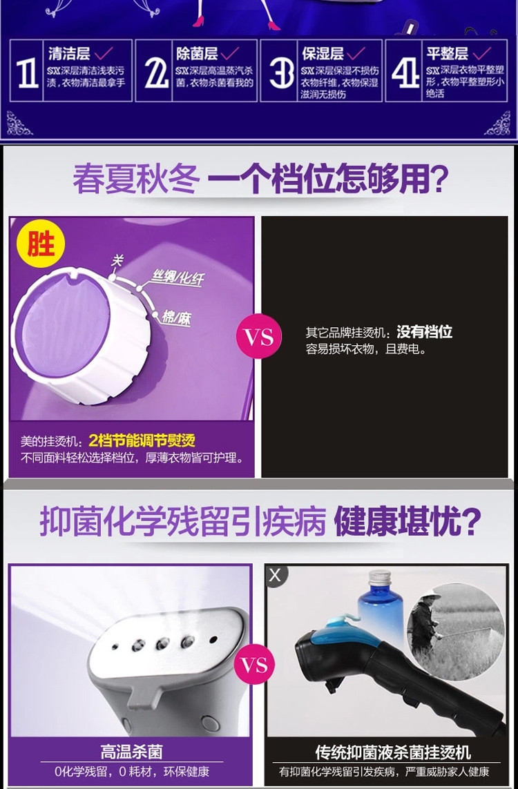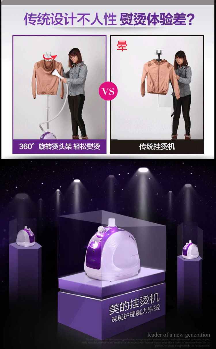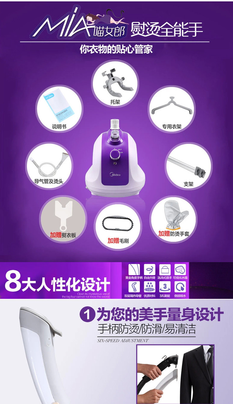 美的掛燙機(jī)YGJ15B3紫色兩檔調(diào)節(jié)輕松熨燙隱藏式萬(wàn)向輪,從此牽著走,靜音熱鍋,無(wú)聲陪伴,締造美麗