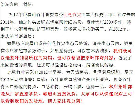 本店已成為淘寶“金牌賣家”,四鉆信譽100%好評,正品保證,假一罰十。銷售范圍:仙芝竹尖、峨眉雪芽、峨眉有機茶三大本土特產(chǎn)茶葉,是您送親朋好友、送領導的最佳選擇。本店銷售的品牌茶葉實惠多多,還包郵哦!